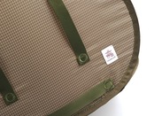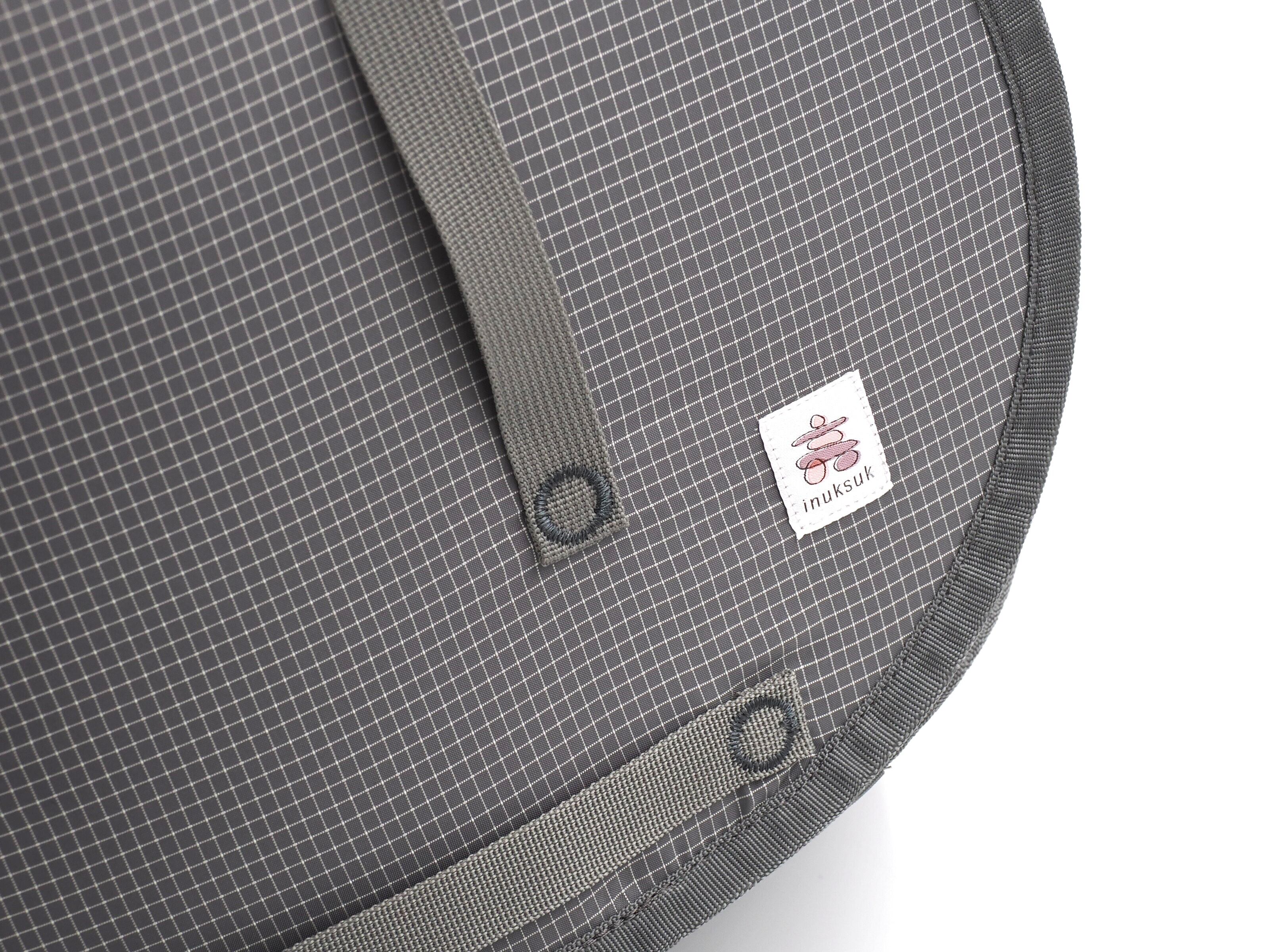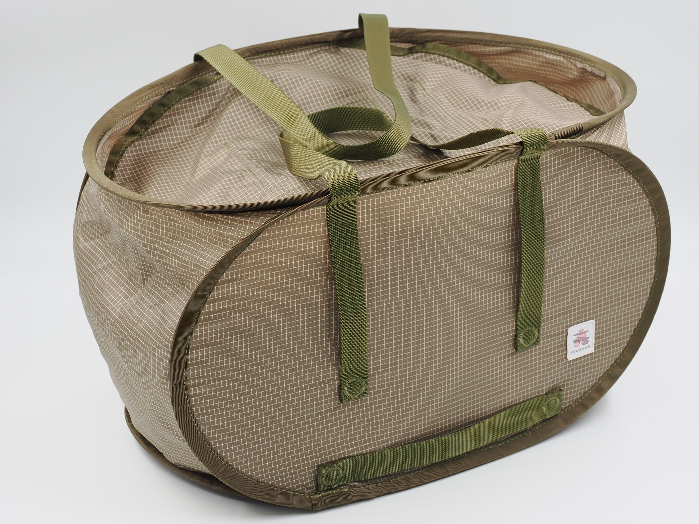 ポップアップテントなどで使われている平ワイヤーを使ったショッピングバッグです。簡単に折りたたみができるので、嵩張らずに持ち運ぶことが可能です。安価な平ワイヤーは歪みが激しいので、安定した張力が得られる高価な平ワイヤーを使用しています。コンピューターミシンで円形の閂を採用しています。助手席などに置いたときに中身を隠すことを目的に、トップカバーにはファスナーを使用していません。トップカバーの内側にメッシュポケットを付けたので、保冷剤などを収納できます。素材は軽量で耐摩耗性や耐候性、耐切創性にも優れている超高分子量ポリエチレンを織り込んだ100Dリップストップを使用しています。サイズを変更した新しいイヌクシュクのラベルがコーナーに付きます。メッシュポーチに入れてお届けします。