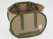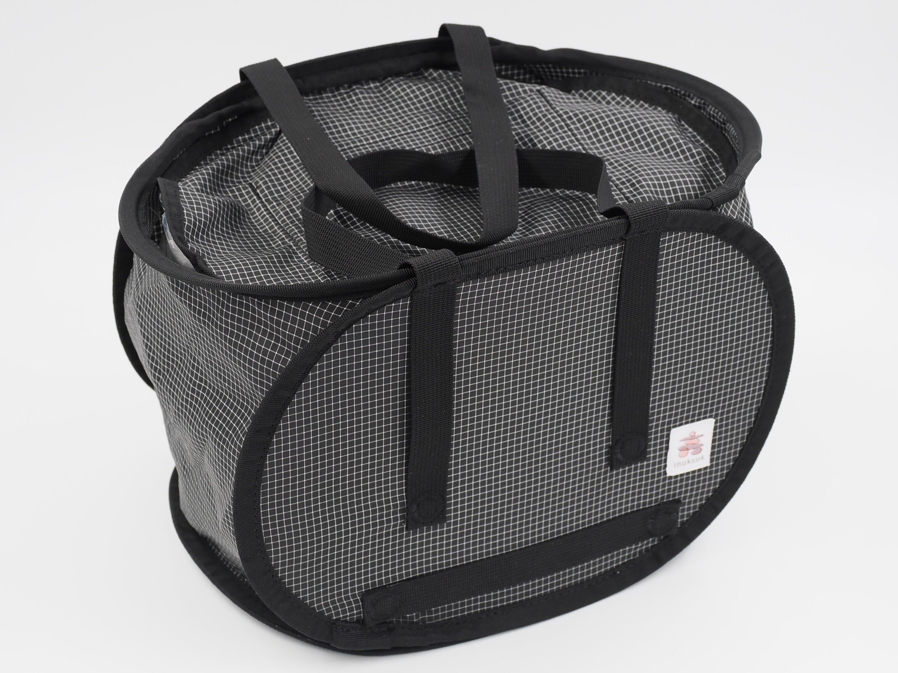 ポップアップテントなどで使われている平ワイヤーを使ったランチバッグです。一般的なお弁当が平置きできるサイズなので、お寿司やおかずが片寄ったり汁がこぼれる心配がありません。簡単に折りたたみができるので、嵩張らずに持ち運ぶことが可能です。安価な平ワイヤーは歪みが激しいので、安定した張力が得られる高価な平ワイヤーを使用しています。コンピューターミシンで円形の閂を採用しています。助手席などに置いたときに中身を隠すことを目的に、トップカバーにはファスナーを使用していません。トップカバーの内側にメッシュポケットを付けたので、保冷剤などを収納できます。素材は軽量で耐摩耗性や耐候性、耐切創性にも優れている超高分子量ポリエチレンを織り込んだ100Dリップストップを使用しています。サイズを変更した新しいイヌクシュクのラベルがコーナーに付きます。