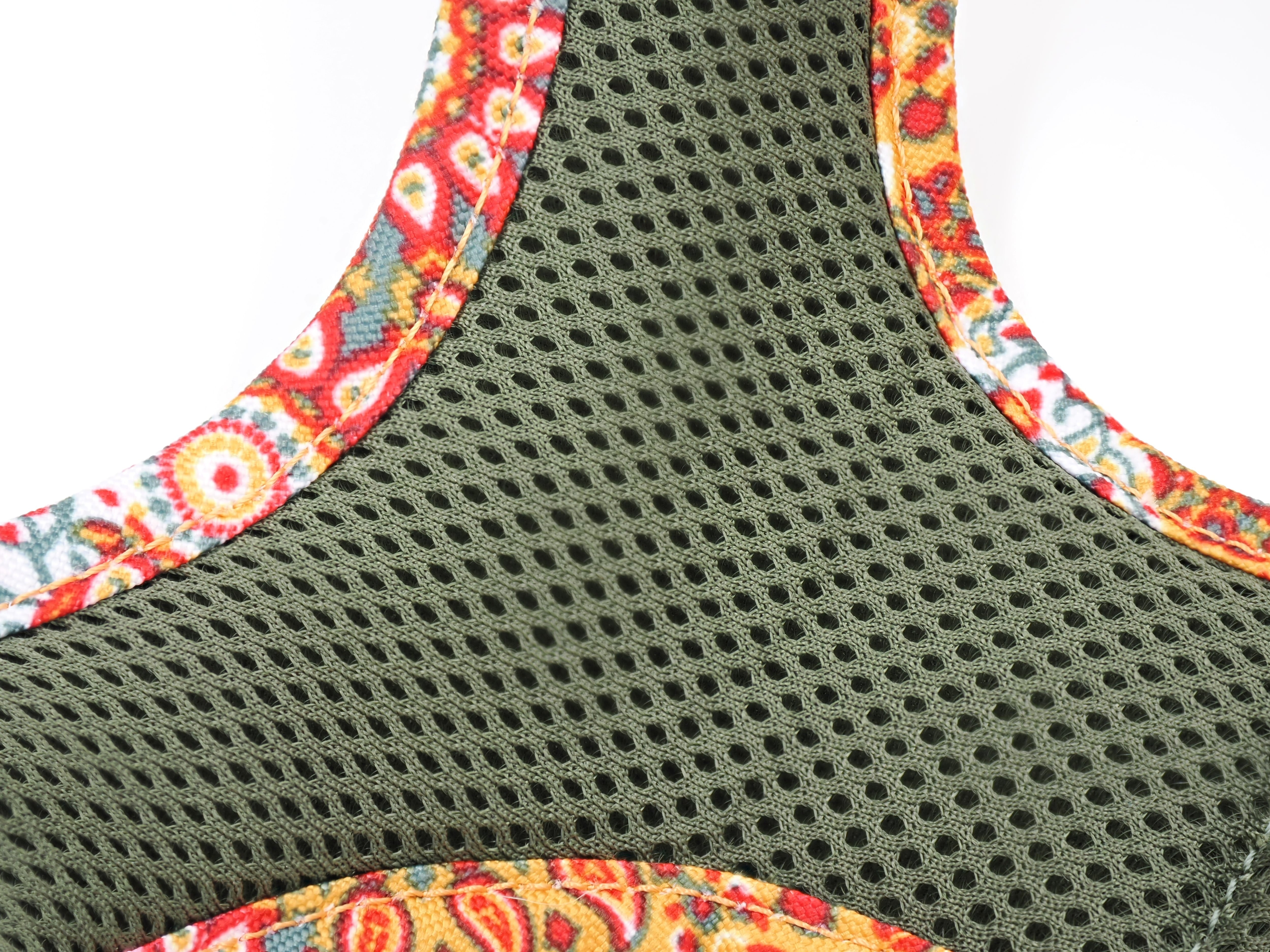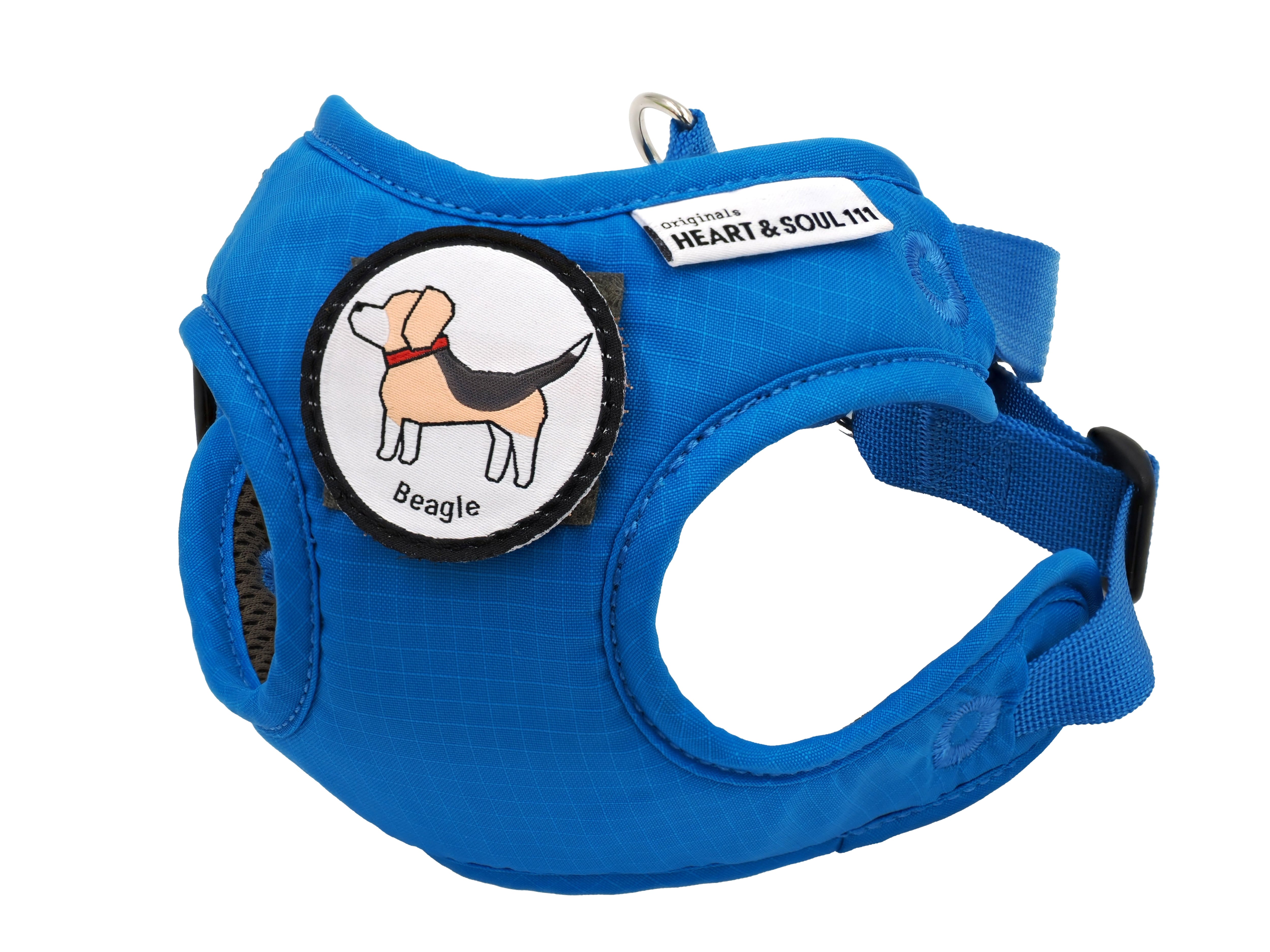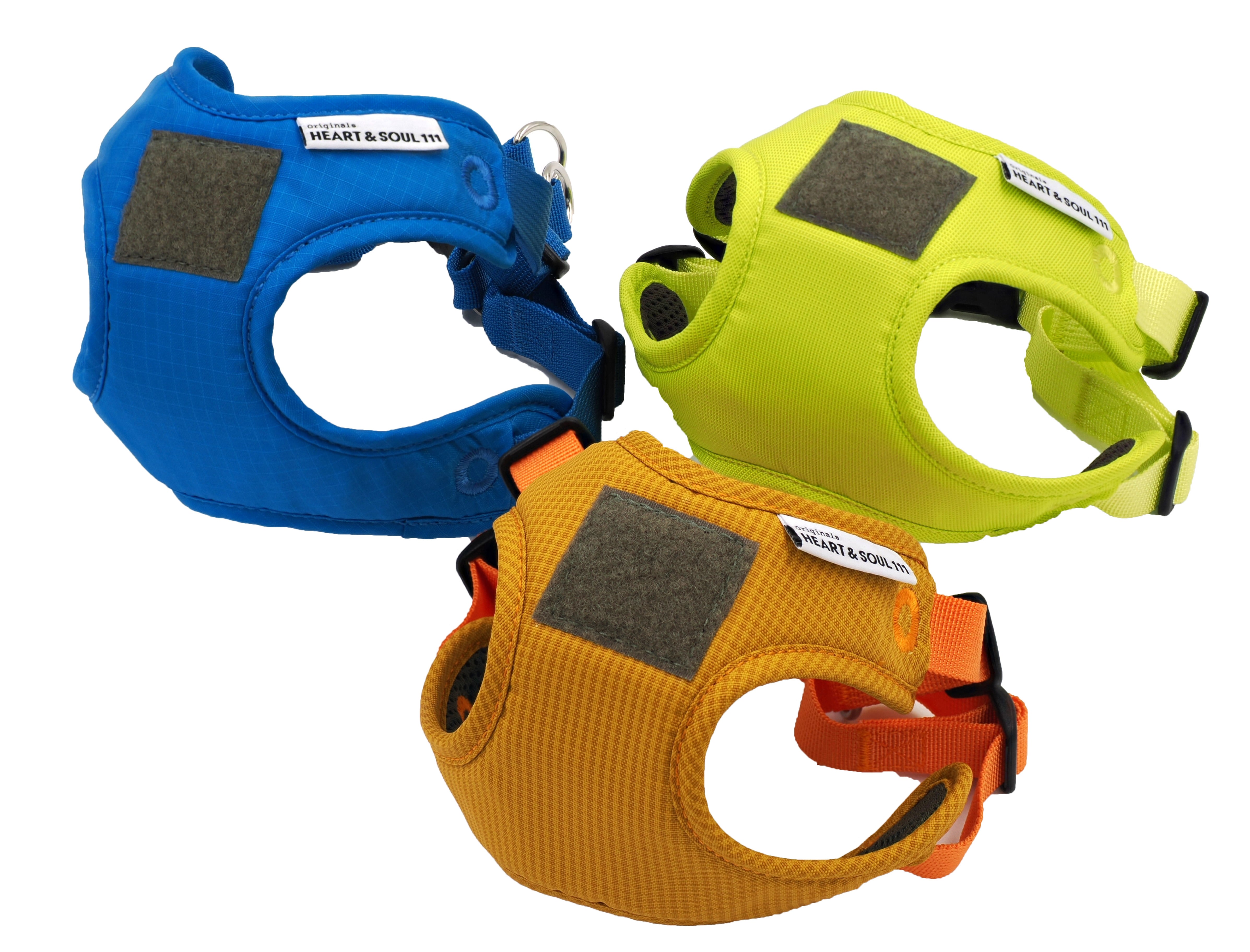 コンピュータミシンによるサークル状のカンヌキ(閂)、裏地に採用したソフトなエアメッシュなど、ハート&ソウル111の拘りが満載です。フロントのマジックテープには、ワッペンを付けることができます。順次犬種毎のワッペンをリリースしていきますので、お楽しみに。