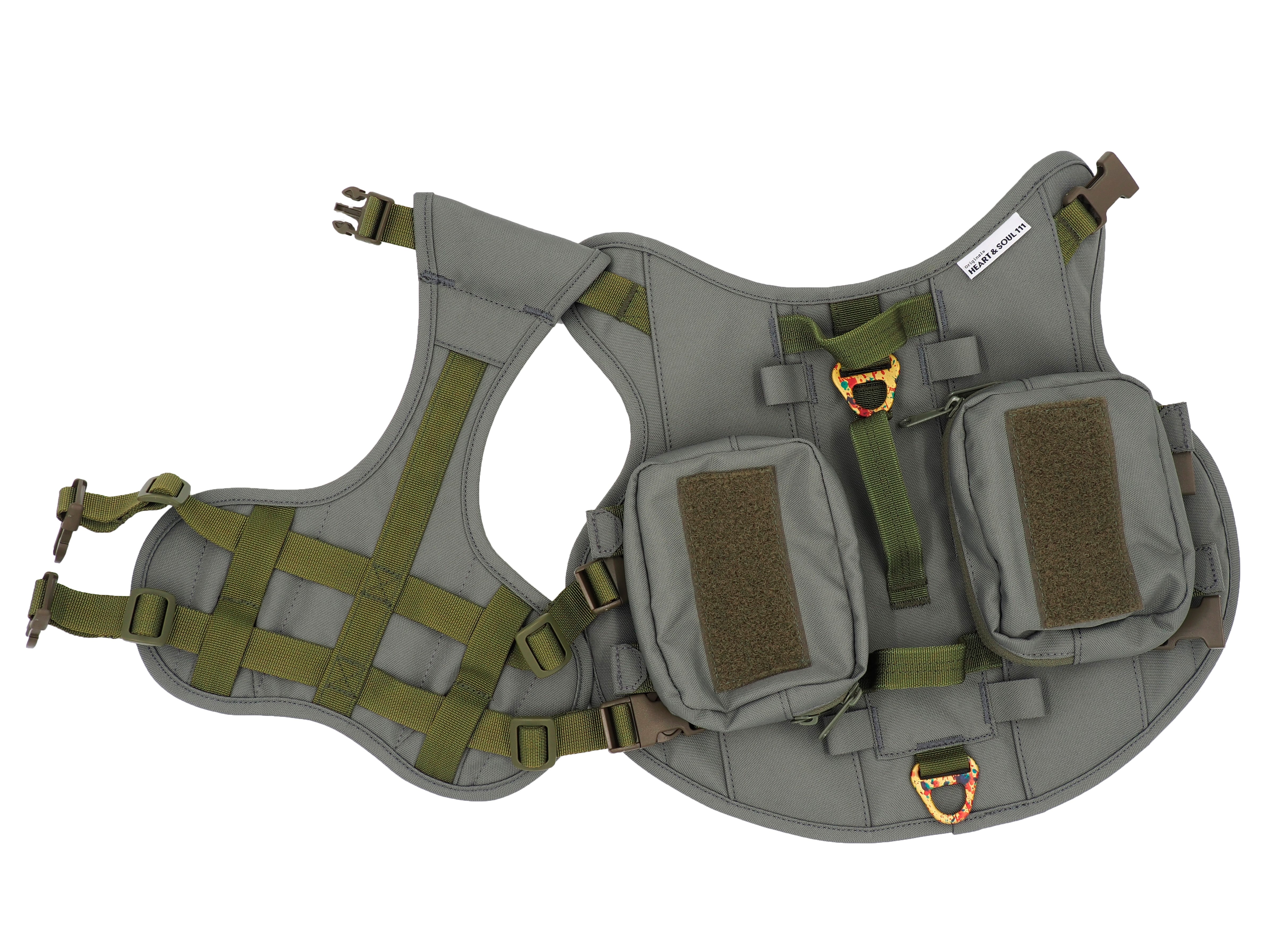 ハート&ソウル111から新しくリリースされたタクティカルハーネスは、アメリカの軍隊や警察で採用されているハーネスのデザインを、最新の縫製技術で形にした商品です。タフでありながら軽量に、ボディを保護しながら動きやすさも追求し、ブッシュなどで遊んでも腹部をしっかりと保護します。調整可能なストラップで体型にしっかりとフィットさせることが可能です。